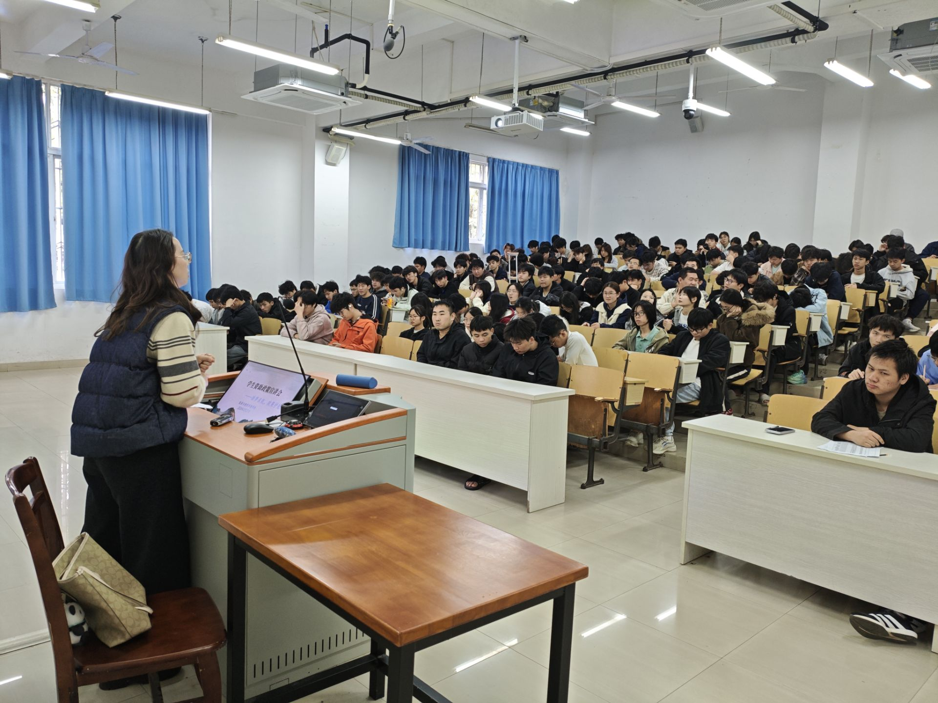 活动现场,资助负责老师结合2024年最新调整的资助政策,为同学们系统讲解本专科阶段全链条资助体系。从入学前生源地信用助学贷款,到入学时便捷高效的绿色通道,再到在校期间奖学金、助学金、勤工助学、困难补助等全方位帮扶政策,资助负责老师逐一细致解读,清晰梳理各项资助申请条件、流程及标准,让同学们对资助政策有了全面、清晰的认知,切实筑牢“不让一个学生因家庭经济困难而失学”的保障防线。
