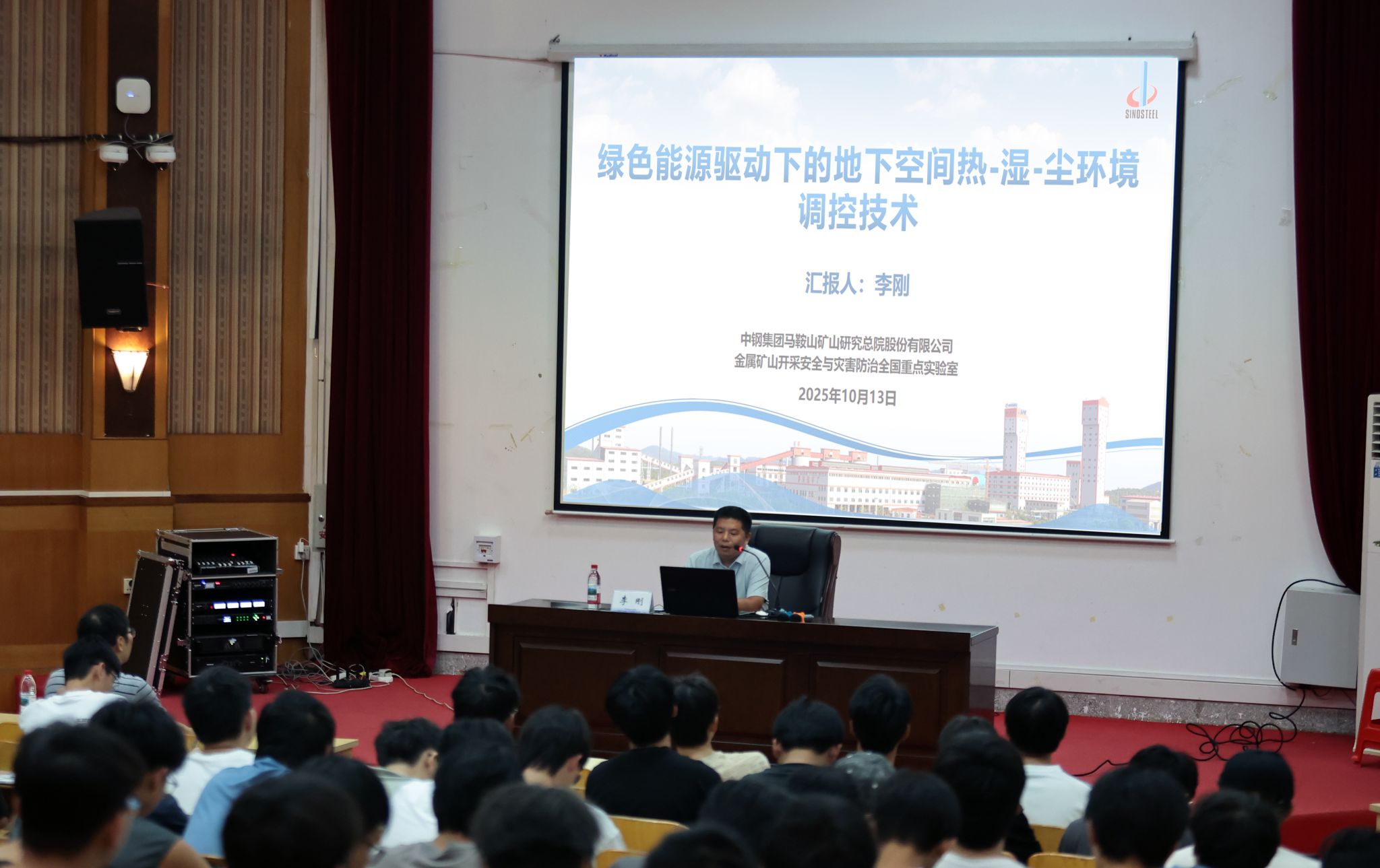 10月13日,金属矿山开采安全与灾害防治全国重点实验室研究员,中钢集团马鞍山矿山研究总院教授级高工李刚来我校进行交流活动,并作了题为《绿色能源驱动下的地下空间热-湿-尘环境调控技术》的讲座。报告会由能源与建筑环境学院副院长吴国珊主持,安全工程、建筑环境与能源应用工程专业代表教师和学生共计150余人听取了报告。