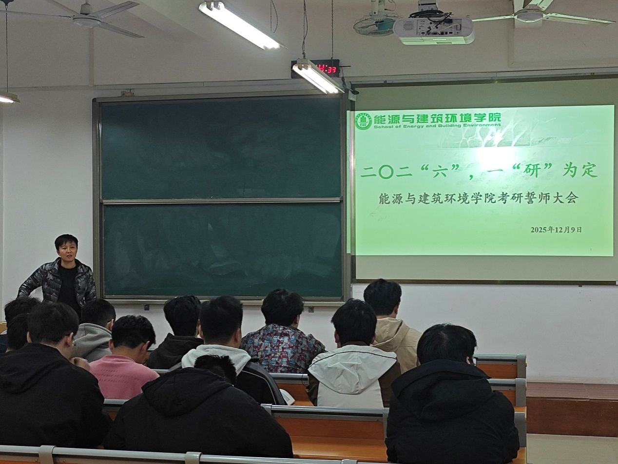 为鼓舞考研学子士气,坚定备考信心,助力同学们全力冲刺迎考。能源与建筑环境学院于12月9日在北校区明志楼211举行以“二〇二‘六’,一‘研’为定”为主题的2026考研誓师大会。学院党委副书记韦喆、辅导员老师及部分考研的学生共同参加了本次活动。